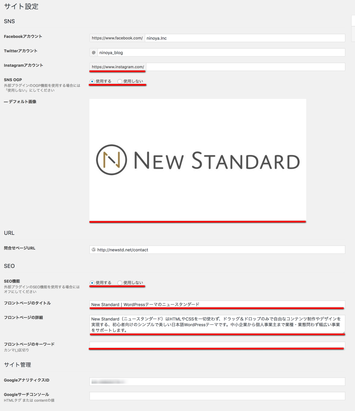 その際、New Standardとプラグインが余計な干渉を起こさないよう、SEO設定・OGP設定それぞれにON/OFFをする機能を加えました。