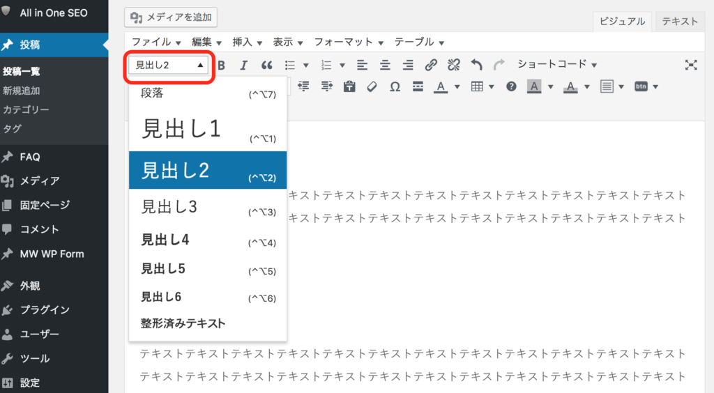 見出しを設定します。大きい見出しは「見出し2」、その次の見出しは「見出し3」…という具合に設定していきます。