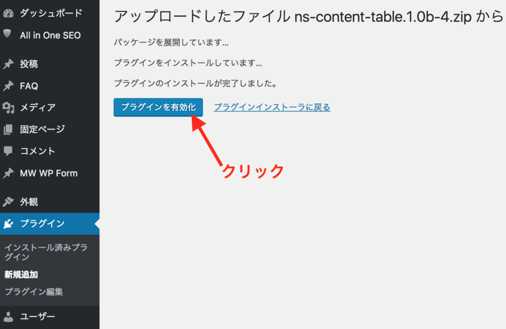 「プラグインのインストールが完了しました。」のメッセージが表示されましたら、「プラグインを有効化」のボタンをクリックします。これでプラグインのインストールと有効化は完了です。