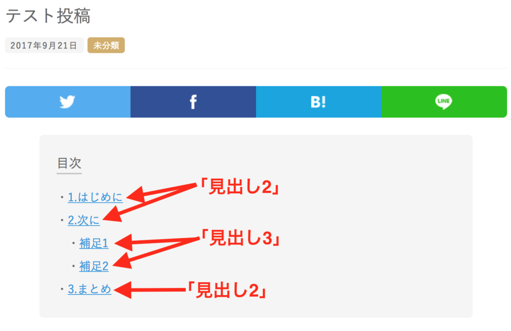 - 投稿記事の本文内に「見出し1」〜「見出し6」を設定する