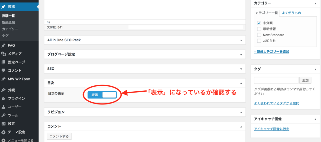 - 目次のボタンが「表示」になっているか確認する。すると、本番環境で目次が自動生成される