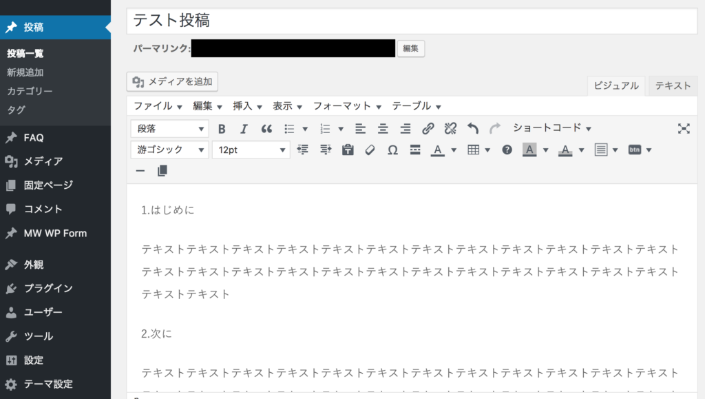 WordPressダッシュボード >「投稿」>「新規追加」にて、投稿記事を新規作成します。