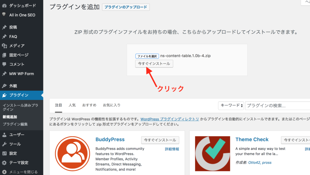 「ファイルを選択」ボタンをクリックし,購入したプラグインファイル (ns-content-table.x.x-x.zip) を選択してインストールします。