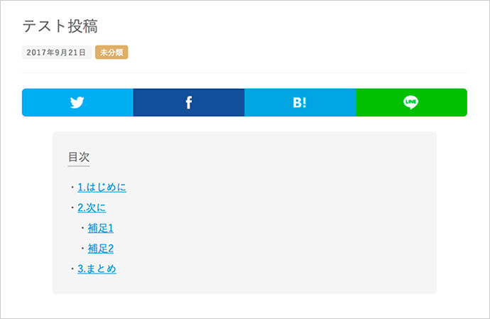 記事上部に目次が自動的に作られ、「見出し2」「見出し3」それぞれに設定したところが、リンク表示されました。
