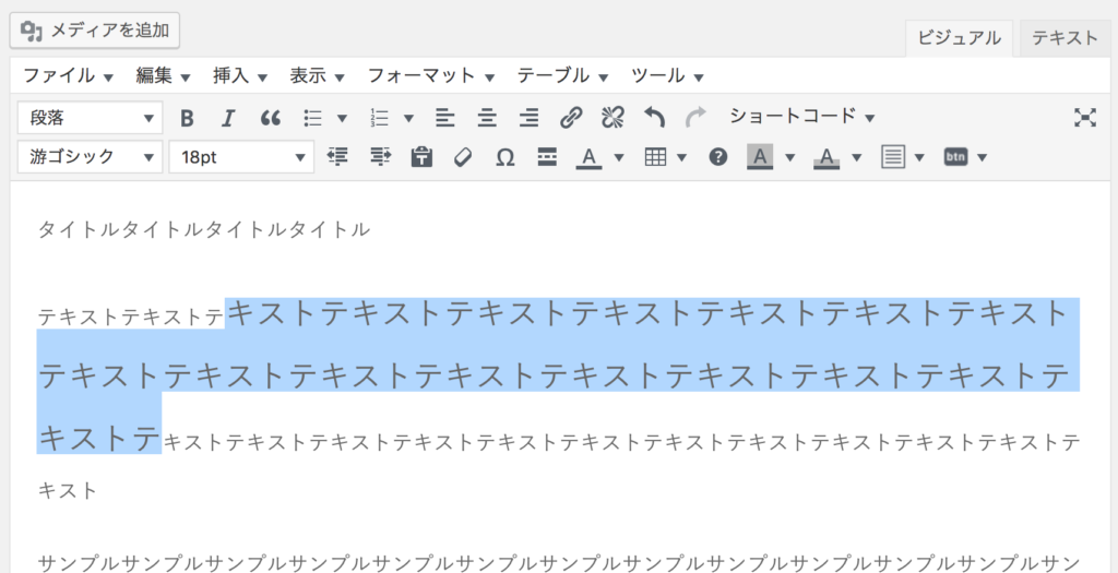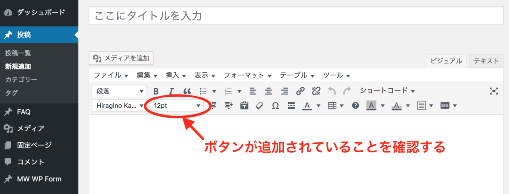 実際の記事の投稿画面を確認します。ビジュアルのメニュー内に、フォントサイズが変えられるボタンが、自動的に追加されました。