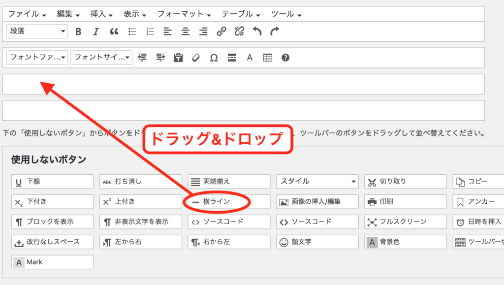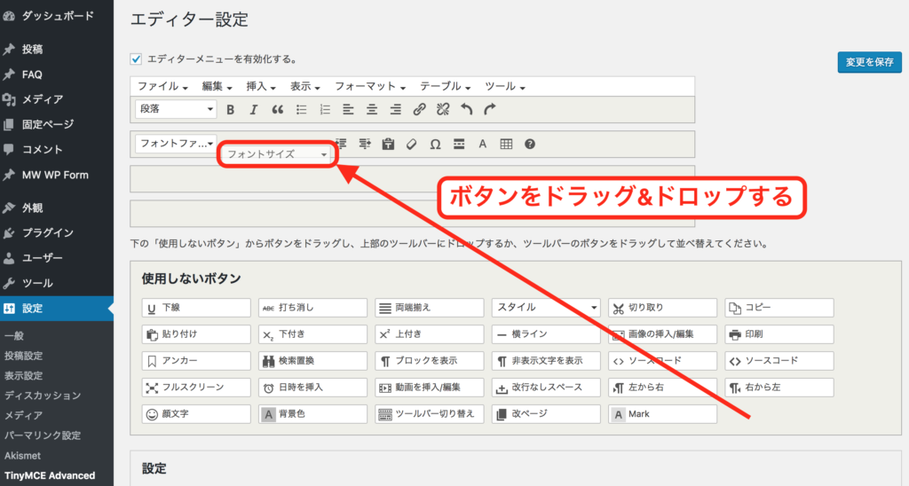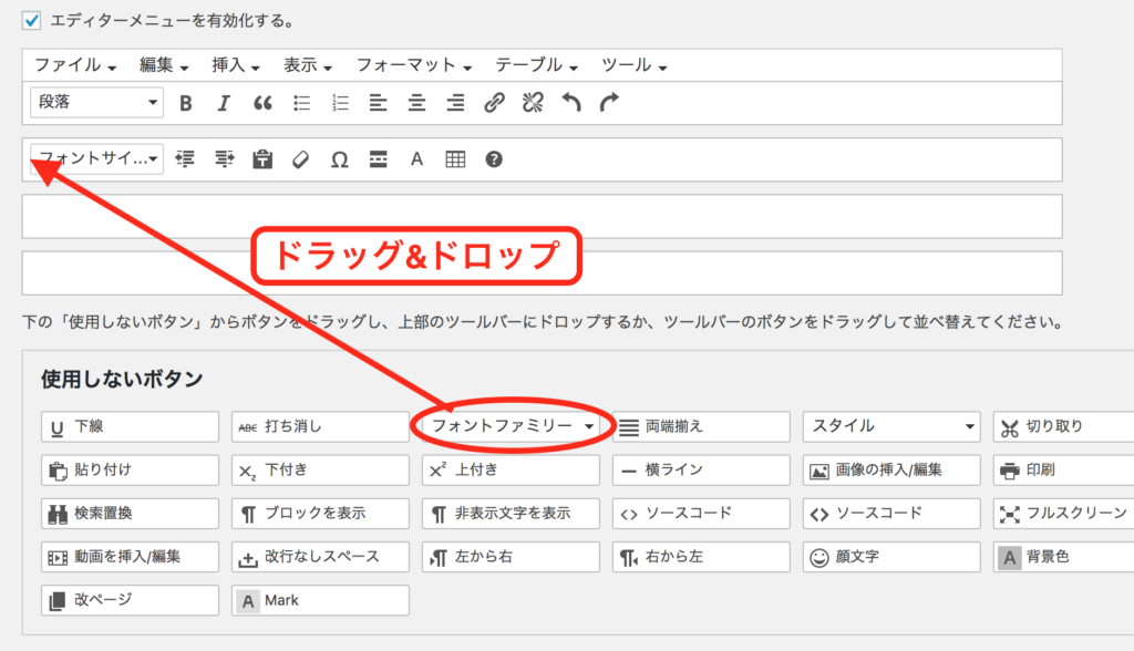 設定画面の下部「使用しないボタン」の中から「フォントサイズ」のボタンを、エディターメニュー内へドラッグ&ドロップします。ドラッグ先の位置指定は任意ですが、できればフォントファミリ(フォント種類)の近くに置くなど、似たような機能の近くに置くと良いでしょう。