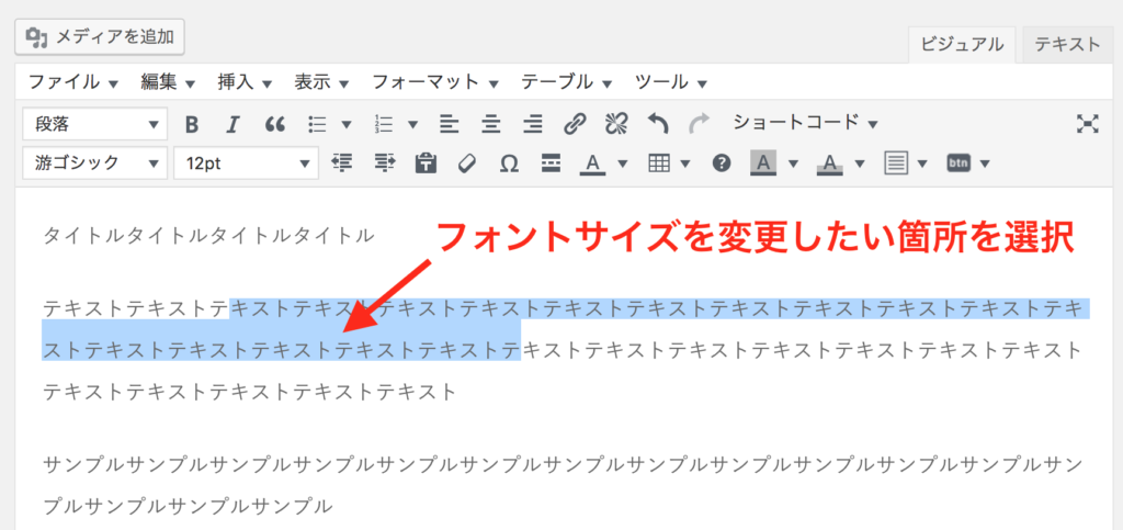 記事の本文内にて、フォントサイズを変更したい箇所を選択します。