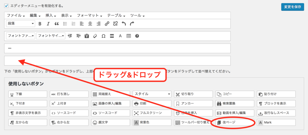 使用しないボタンの枠内から「フォントファミリー」ボタンを、エディターメニュー内へドラッグ&ドロップし、青色の「変更を保存」ボタンをクリックします。