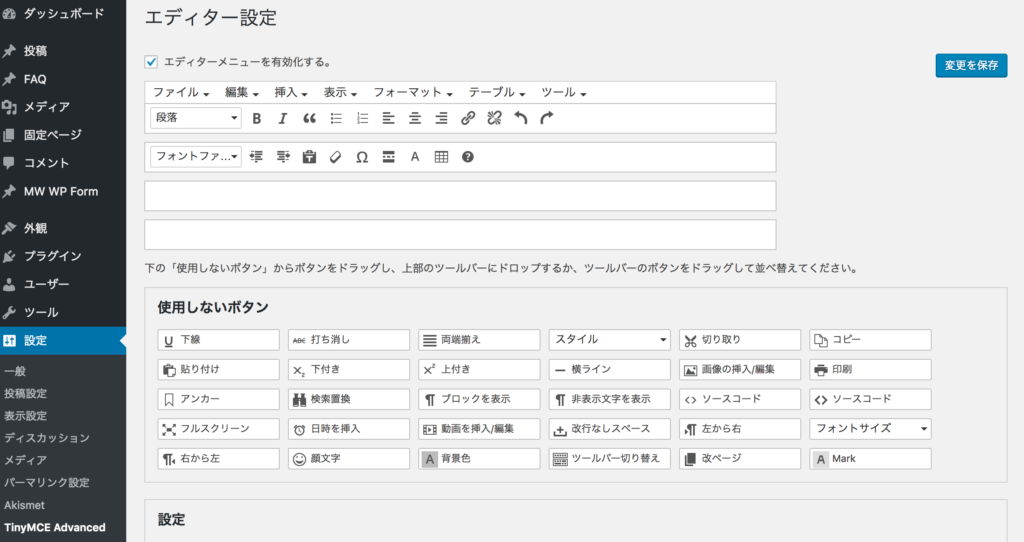 すると、このようなTinyMCE Advancedの設定画面が表示されます。