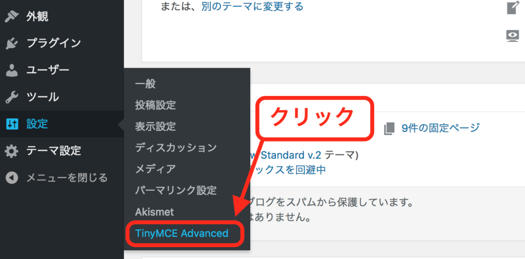 ダッシュボードのメニュー「設定」内にある「TinyMCE Advanced」のリンクをクリックし、TinyMCE Advancedの設定画面を表示します。