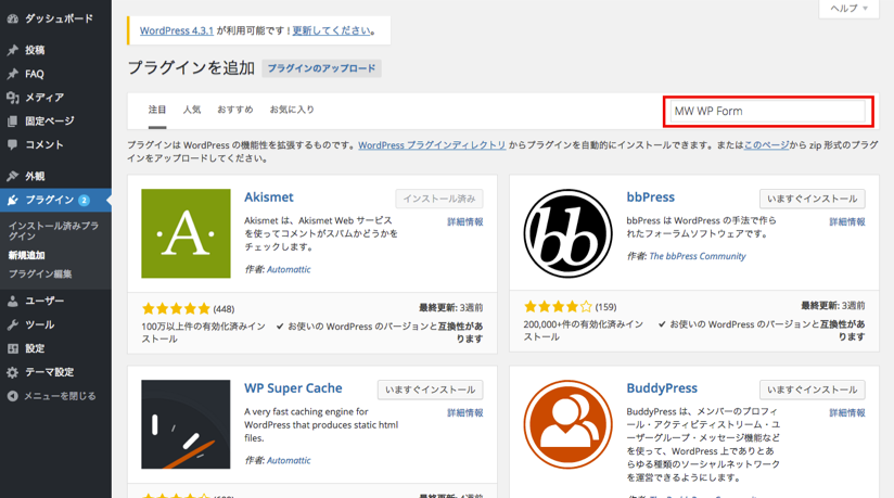 管理画面よりプラグイン>新規追加>画面右上の検索バーより「MW WP Form」を検索してください。
