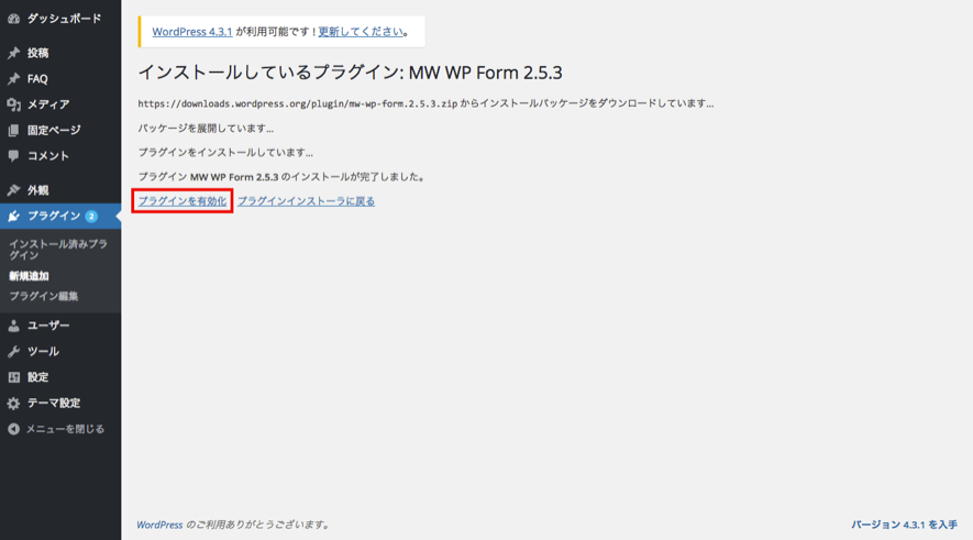 「プラグインを有効化」ボタンをクリックします。自動的に問合せページが作成されます。
