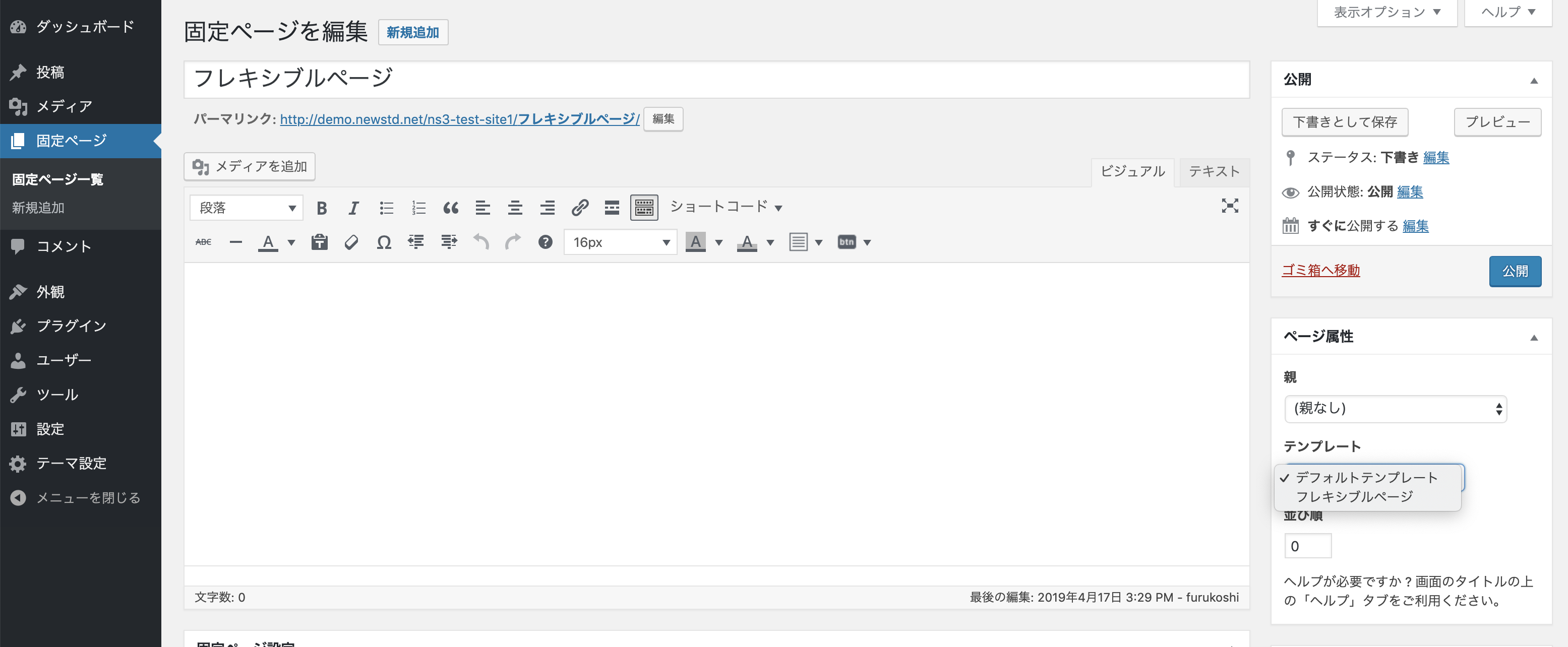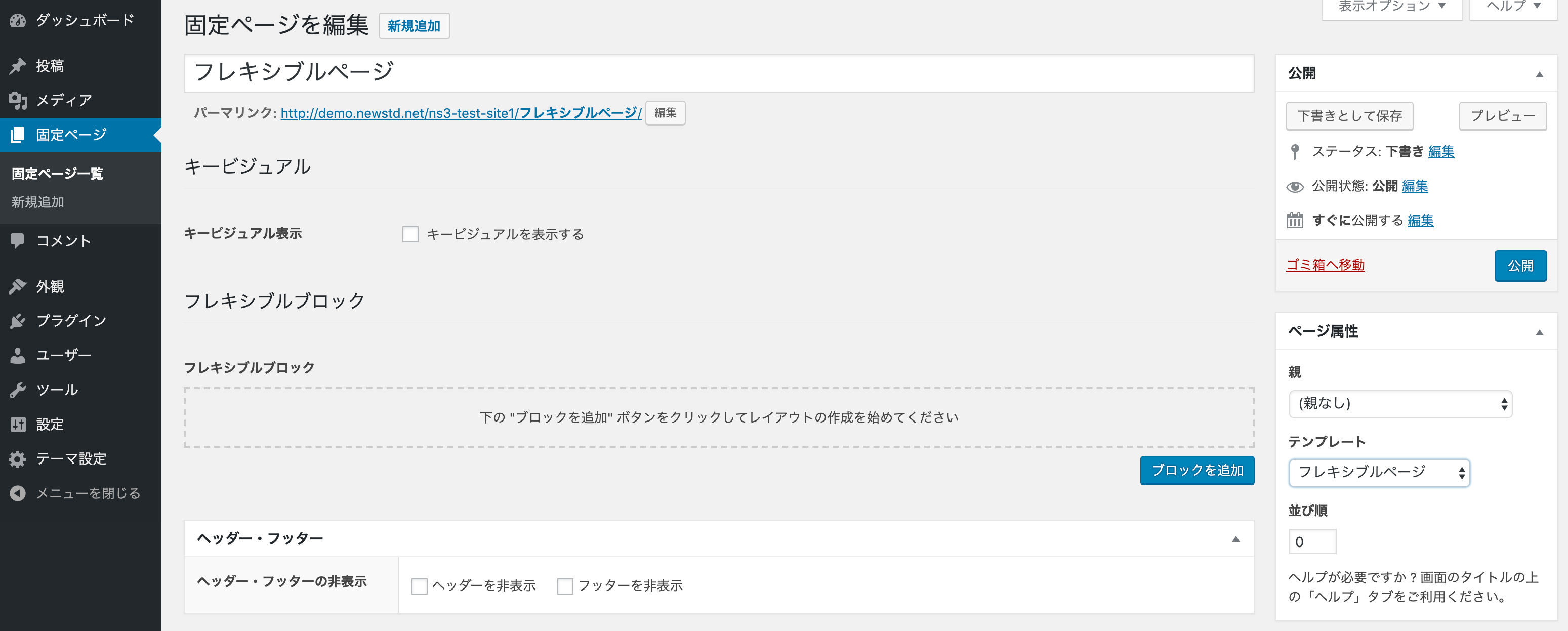 固定ページ>新規追加>画面右側のページ属性>テンプレート>「フレキシブルページ」を選択