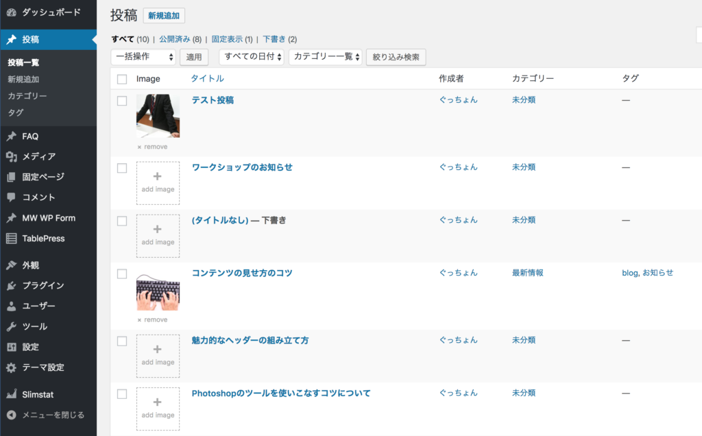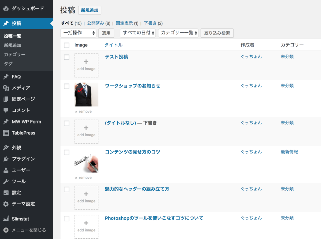 - プラグイン「Easy Featured Images」を有効化した時点で、投稿一覧にサムネイル画像が表示される