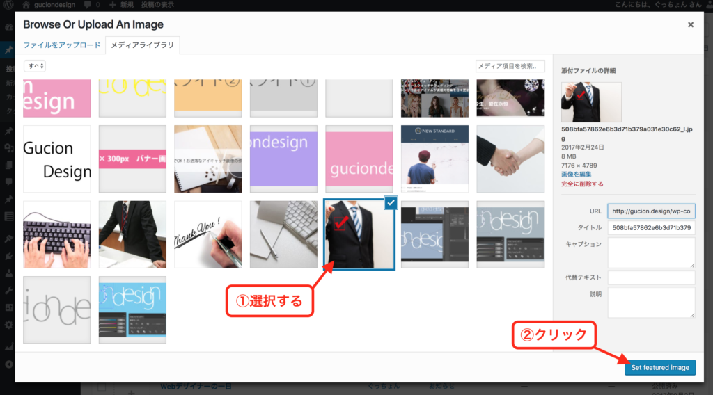 アップしたいアイキャッチ画像を選択し、右下「Set featured image」をクリックします。