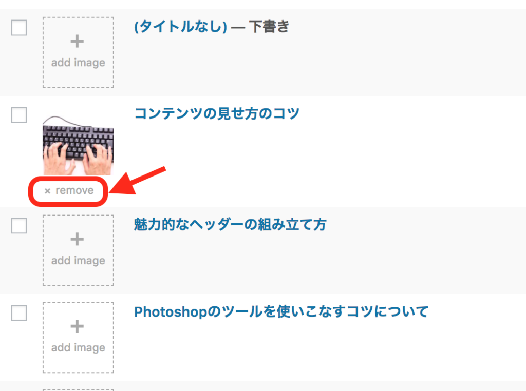 また、アイキャッチ画像を削除したい場合には、そのサムネイル画像の下にあります「remove」をクリックします。