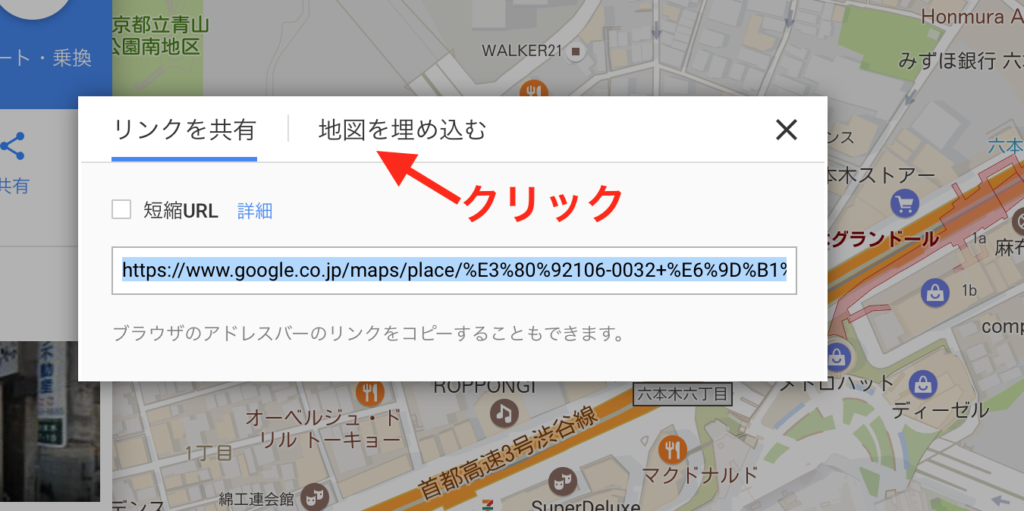 リンクを共有するポップアップ画面が表示されます。ここで「地図を埋め込む」リンクをクリックします。