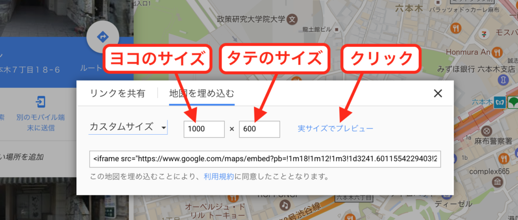 設置したい地図のサイズを設定します。固定ページ用であれば「横1,000ピクセル×縦600ピクセル」ですね。設定後「実サイズでプレビュー」のリンクからチェックを行います。