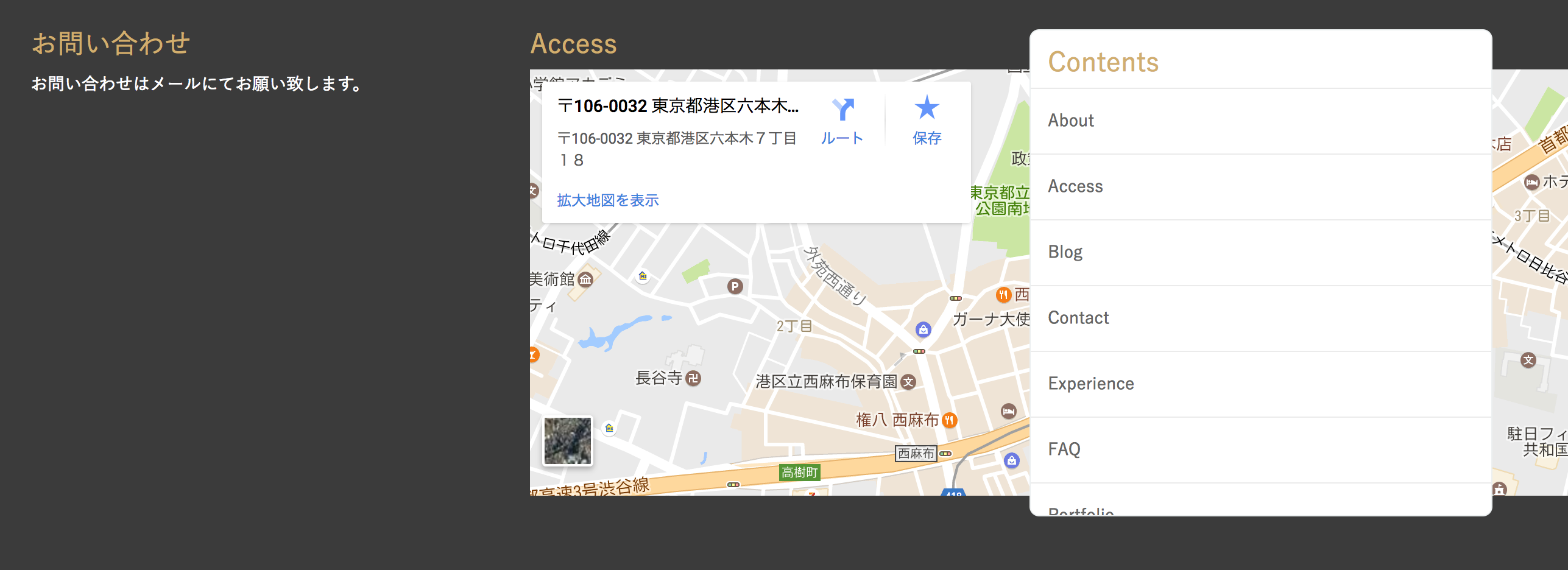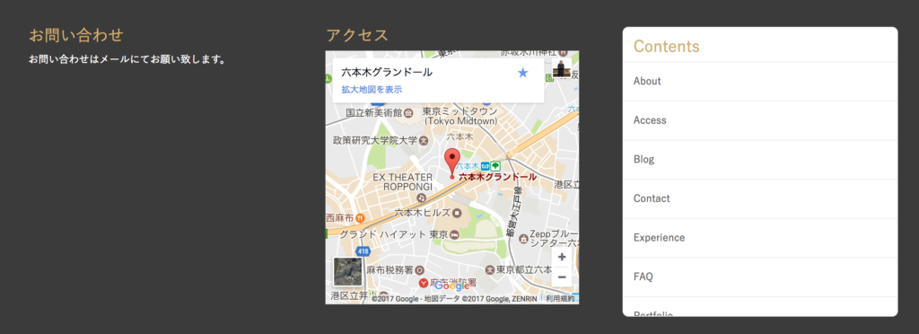 実際のページのフッターを確認します。入力したタイトルと、埋め込まれたGoogleMapが表示されていることを確認します。