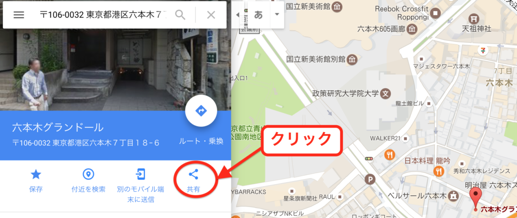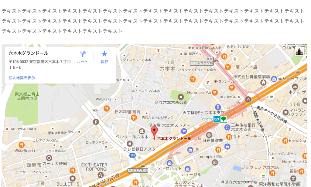 - Google Mapにて、埋め込みたい場所の住所を指定する