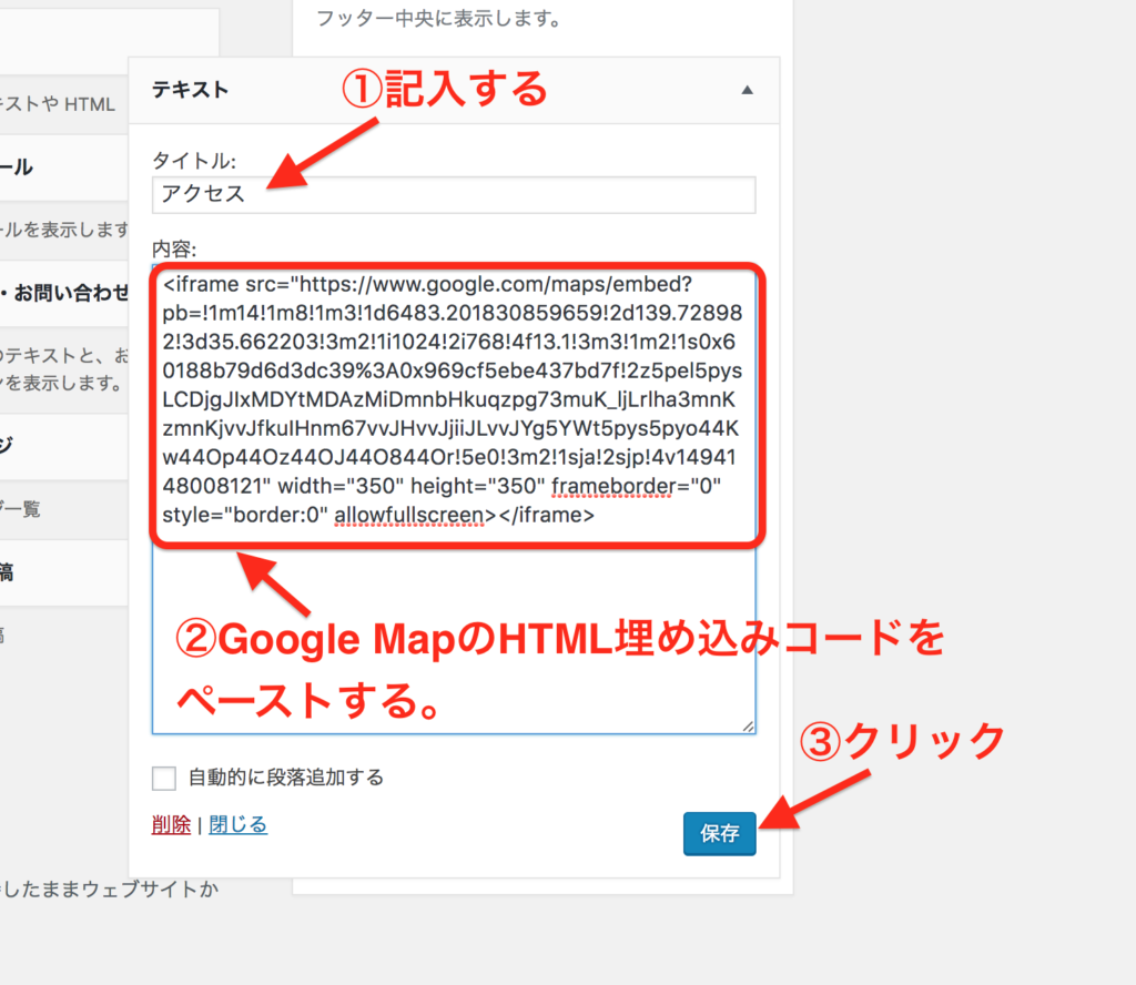 「テキスト」のタイトルに「アクセス」と入力し、内容にはフッターに適した「横300ピクセル×縦300ピクセル」のGoogle Mapの埋め込みコードをペーストします。最後に「保存」ボタンをクリックします。
