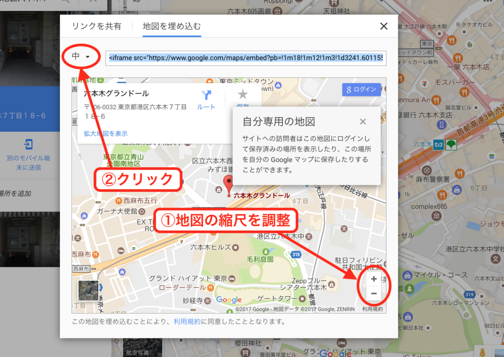 地図を埋め込むための編集画面がポップアップで表示されます。Google Mapの右下にある縮尺ボタンで地図の縮尺を調整し、ポップアップ左上にあるサイズボタン「中」をクリックします。