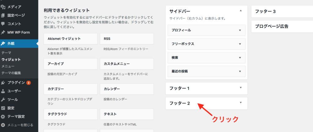 ここでは例としてフッター中央部にGoogleMapを埋め込みますので、メニューの「外観 > ウィジェット」から画面右側にある「フッター2」をクリックします。