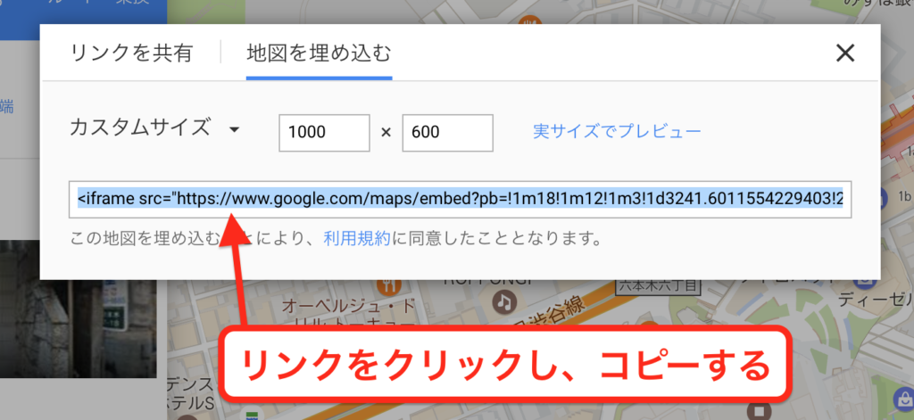 ポップアップで地図が表示されます。こちらが、実際に埋め込む地図の実サイズです。実サイズや縮尺などを確認したら、そのポップアップは閉じましょう。