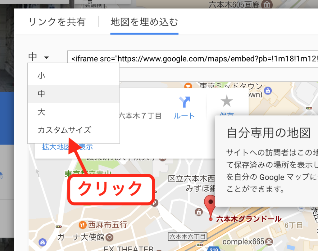 小、中、大……と、埋め込む地図のサイズを選ぶことができます。ここでは自由にサイズを調整できる「カスタムサイズ」をクリックします。