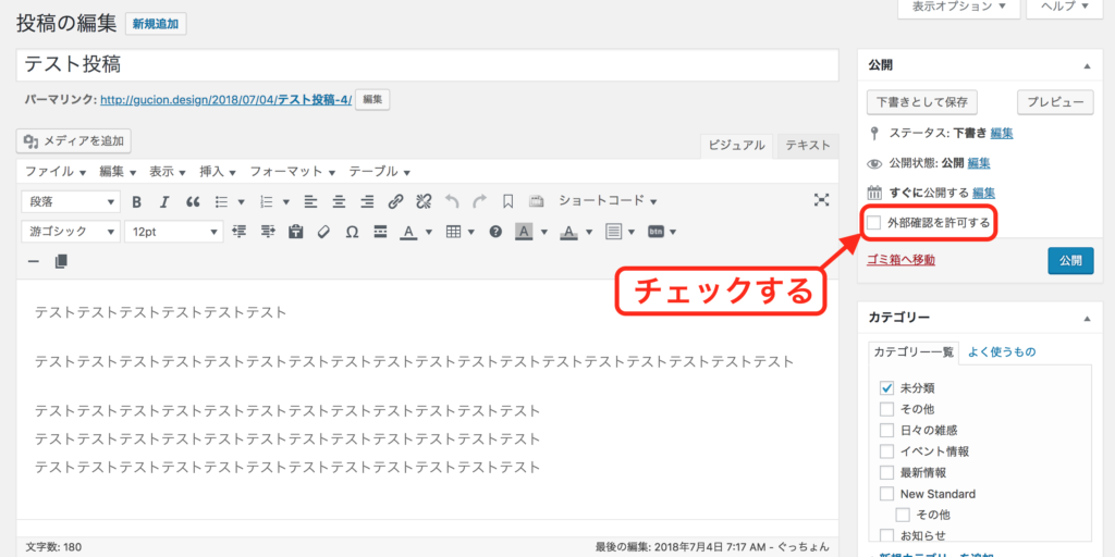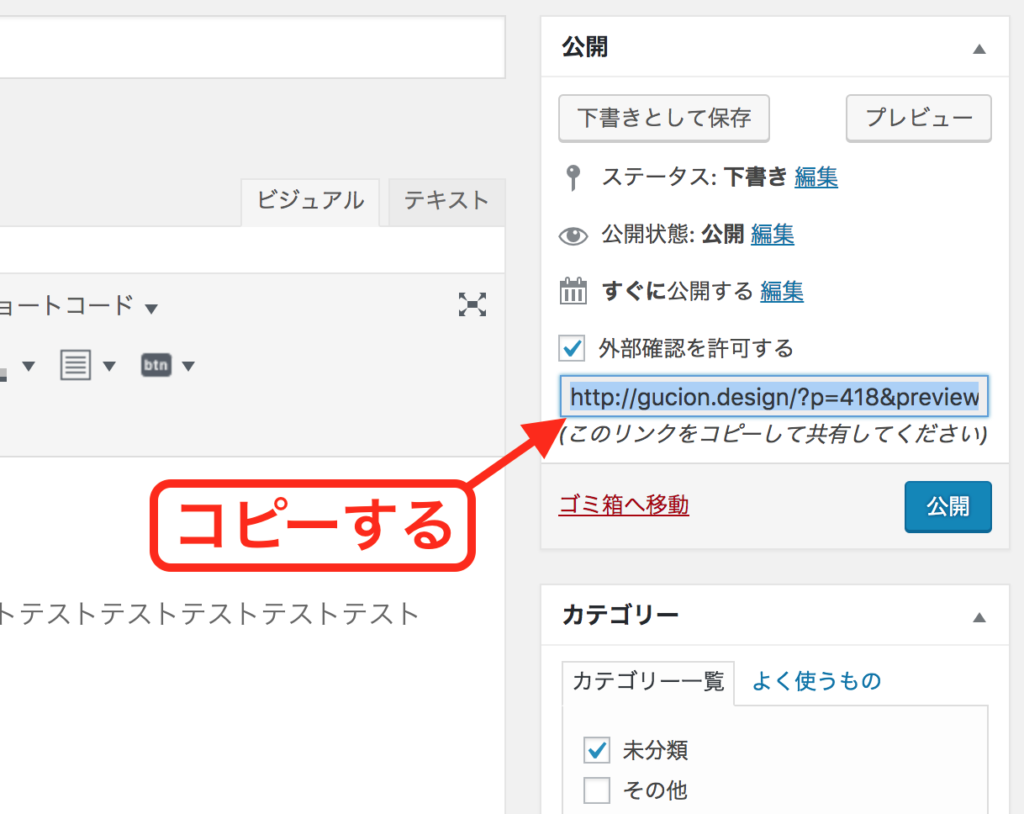 - 下書き状態の投稿画面より、画面右上「公開」欄にある「外部確認を許可する」にチェック