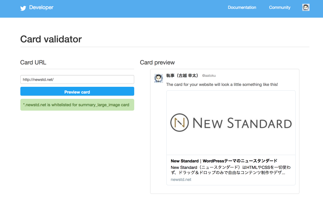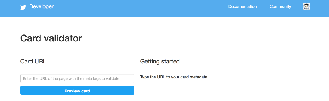 Twitterにも同様に「Card validator」という専用の確認サイトが用意されています。確認したいURLを入力して、「Preview card」ボタンを押すだけです。