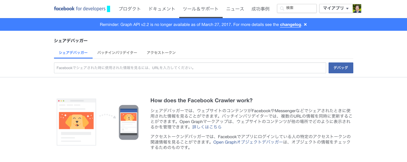 使い方も簡単。確認したいURLを入れて「デバッグ」ボタンを押すだけです。