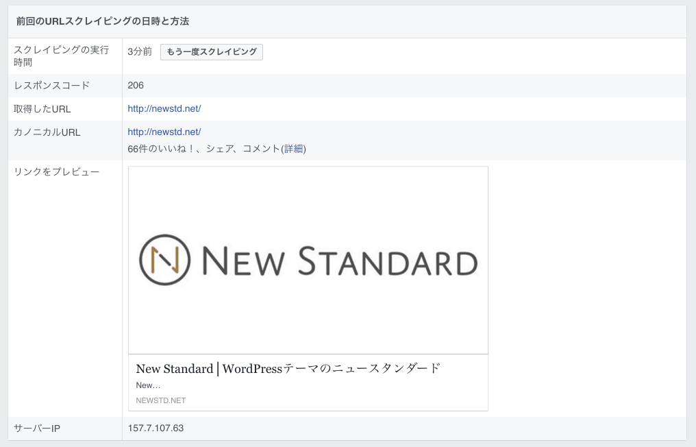 例えばNew StandardのトップページのURLだと、Facebook投稿時に上記のように表示されることが分かります。これが意図した内容と違った場合は、ページのタイトルや、アイキャッチ画像を修正します。