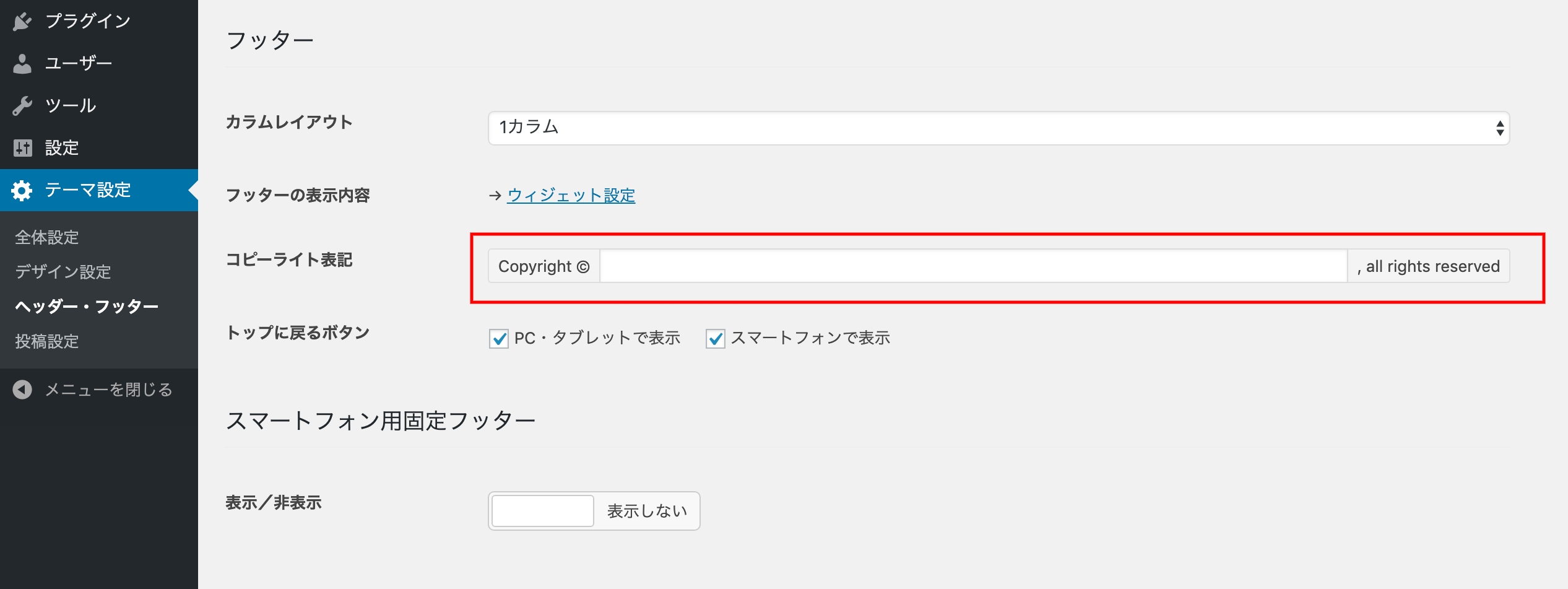 テーマ設定>ヘッダー・フッター>コピーライト表記