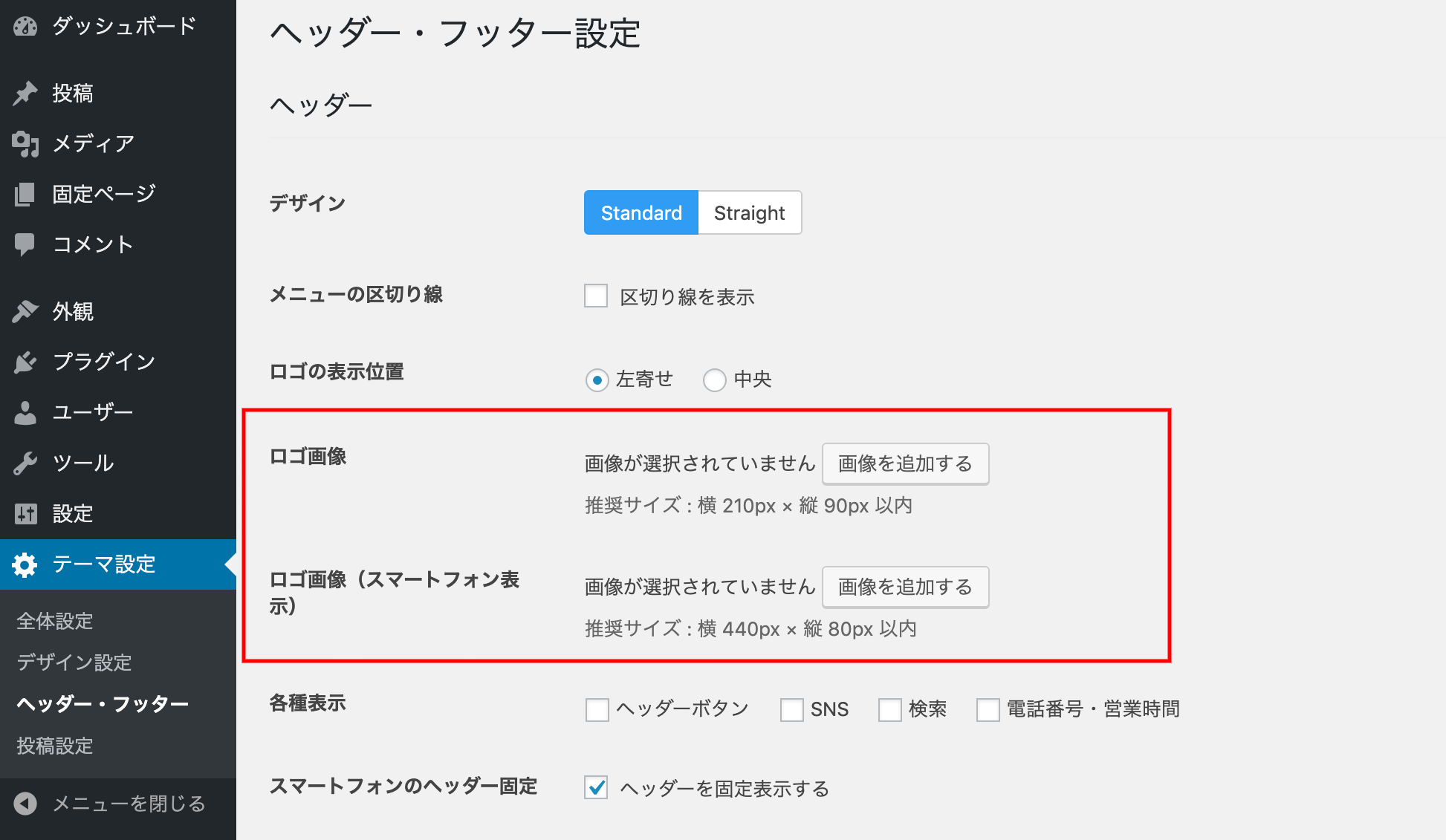 テーマ設定>ヘッダー・フッター>ロゴ画像>「画像を追加する」ボタンをクリックしてロゴ画像をアップロード>画面右上「変更を保存」ボタンをクリック