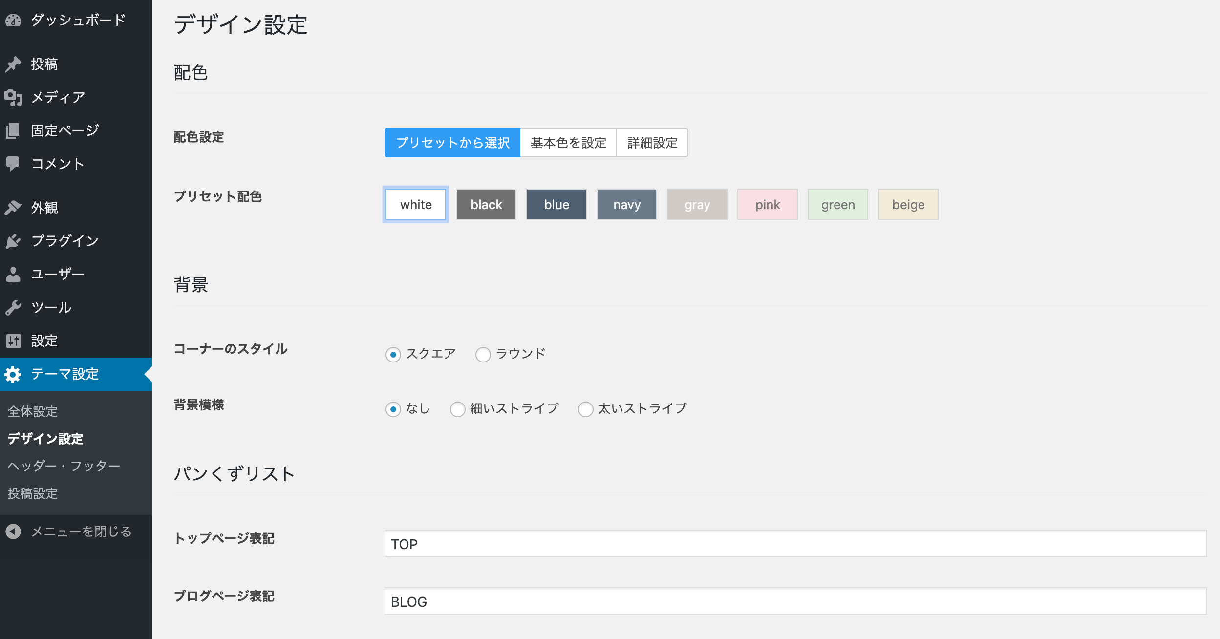 テーマ設定>デザイン設定>プリセット配色よりお好みのカラーを選択>画面右上「変更を保存」ボタンをクリック